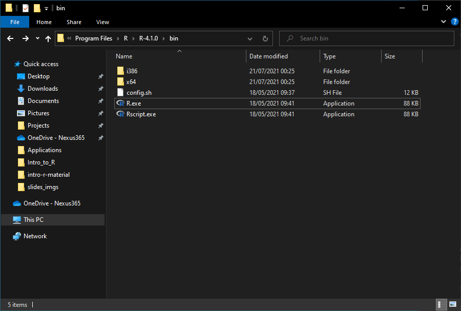 By default, the R base package is installed at C:\Program Files\R\R-4.x.y for version 4.x.y on Windows. Open your file explorer to that location, and you will find an executable file named R.exe in the bin directory.