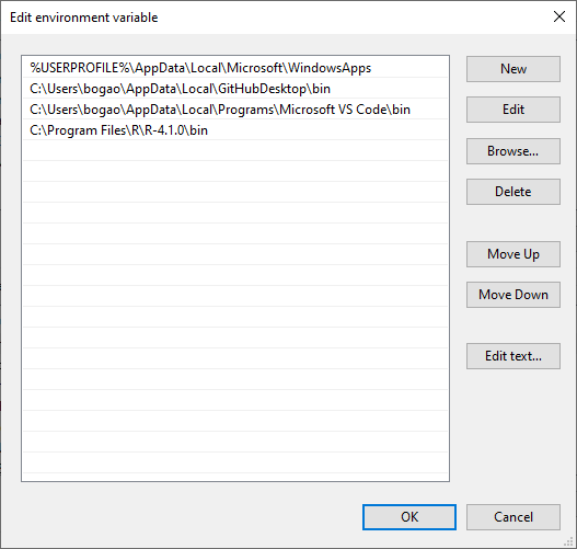 In order to access R.exe quickly on the command line, we add C:\Program Files\R\R-4.x.y\bin to the operating system (OS)’s PATH environment variable. On Windows,