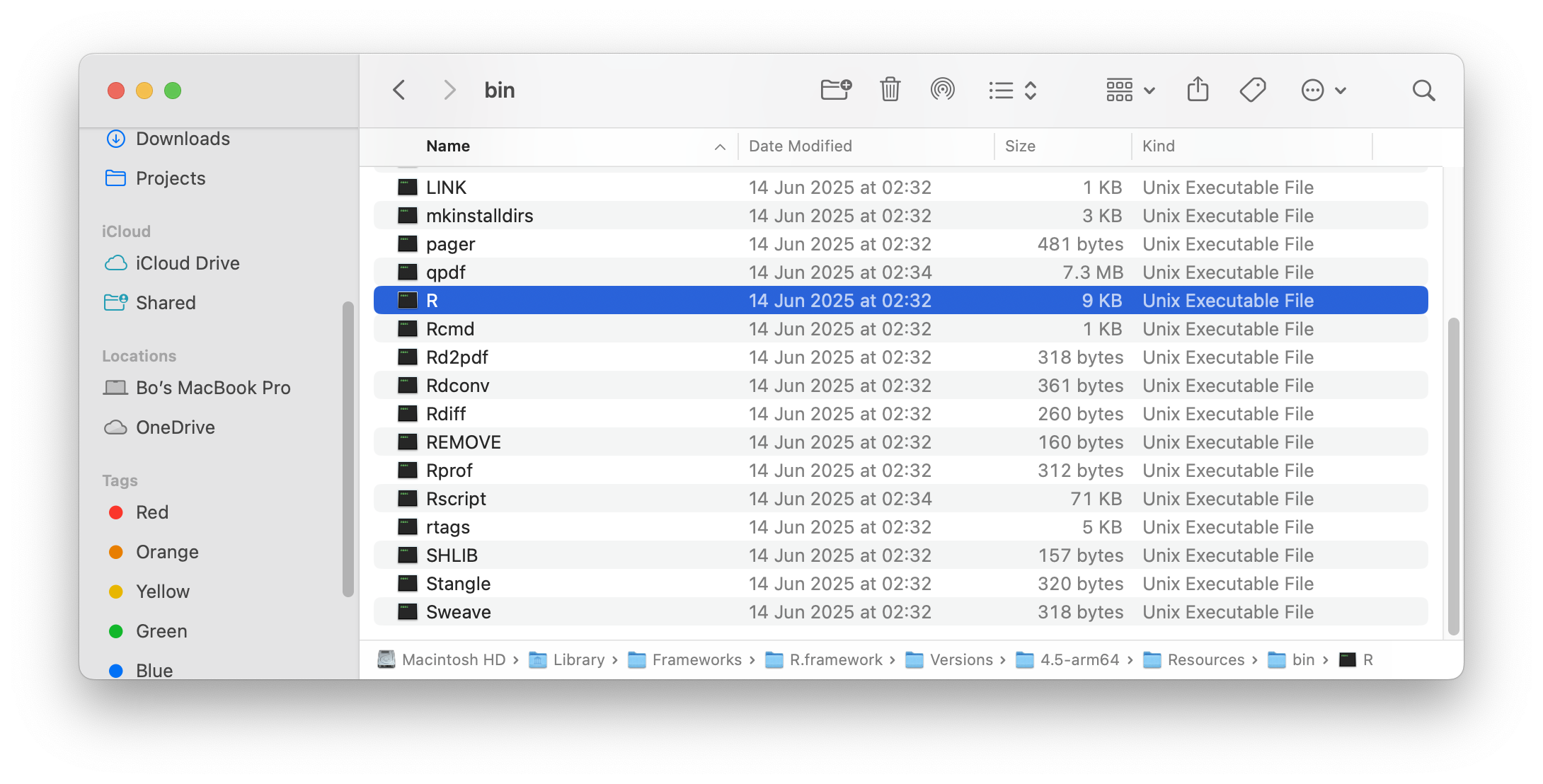 RandRscript. See screenshot below showing the contents of thebindirectory, and note that the directory actually further links to the/Library/Frameworks/R.framework/Versions/4.5-arm64/Resources/bindirectory.
