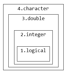 We can see that values from the more strict type is always coerced to the less strict type. For instance, when TRUE and 100L are combined, the logical TRUE is coerced to the integer value of 1L. This is because the integer type in this instance is able to present TRUE in its entirety, whereas the opposite is not possible. Following the same logic, we can rank the four atomic types as illustrated: