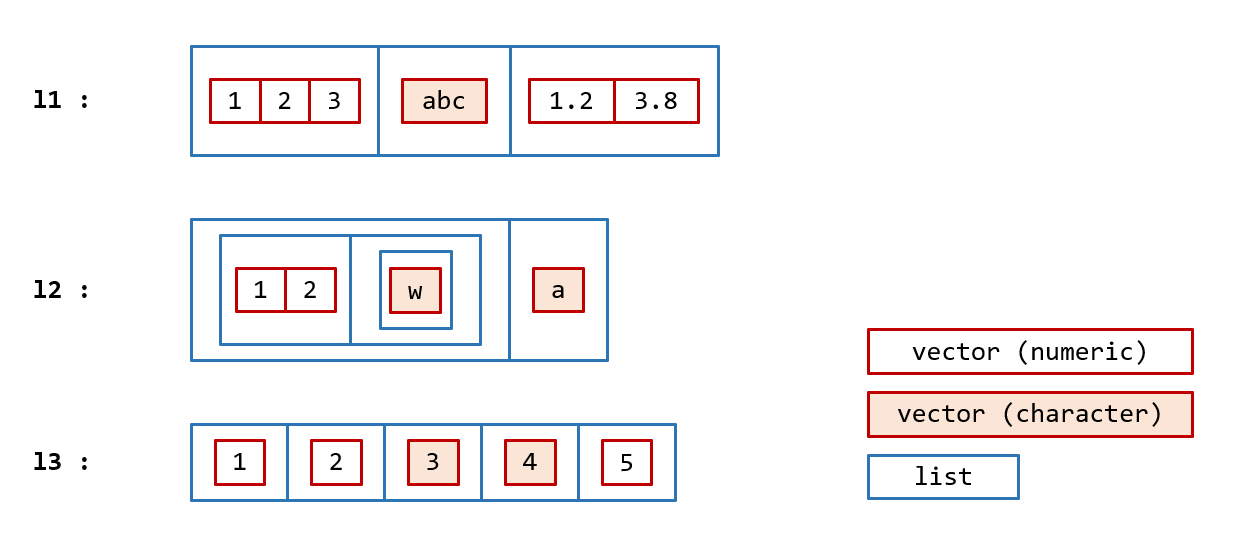 - Lists are collections of vectors and lists. The vectors within this collection may be of any type, and of any length.