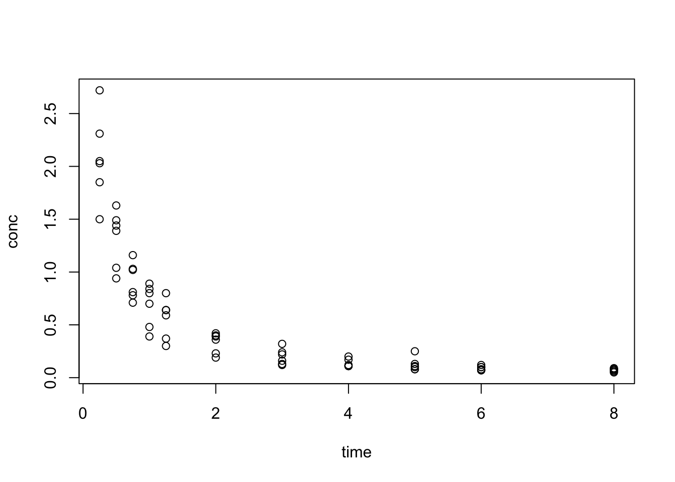 plot(conc ~ time, data = Indometh)