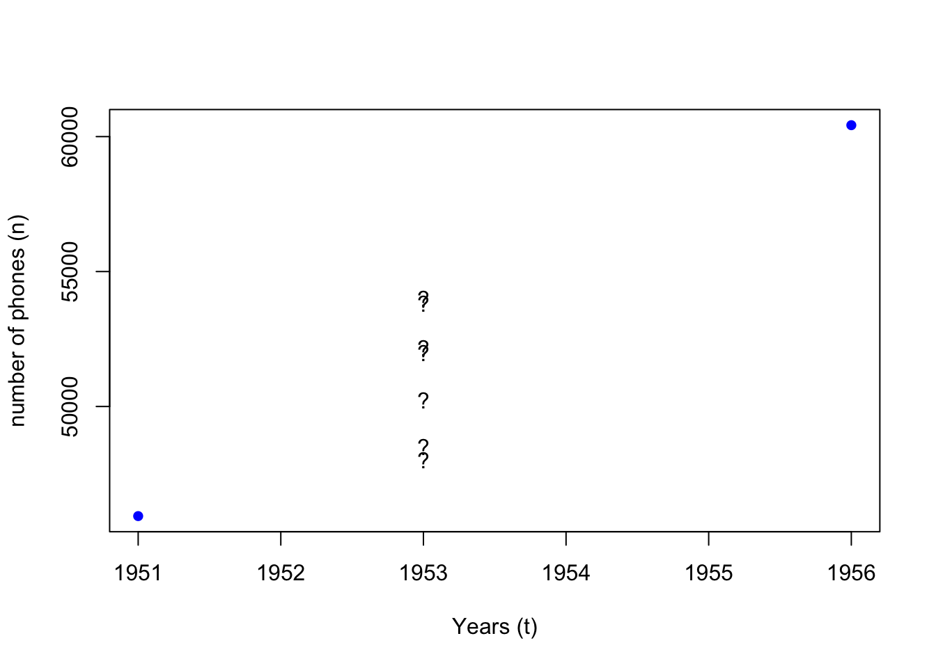 x = rownames(WorldPhones)[1:2], xlab = "Years (t)", col = "blue", pch = 16,