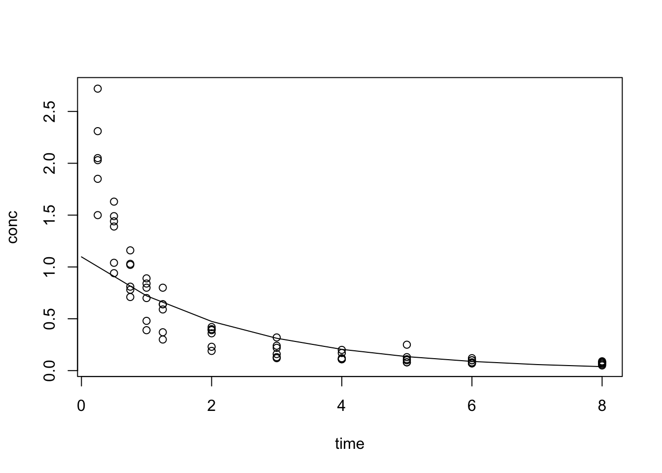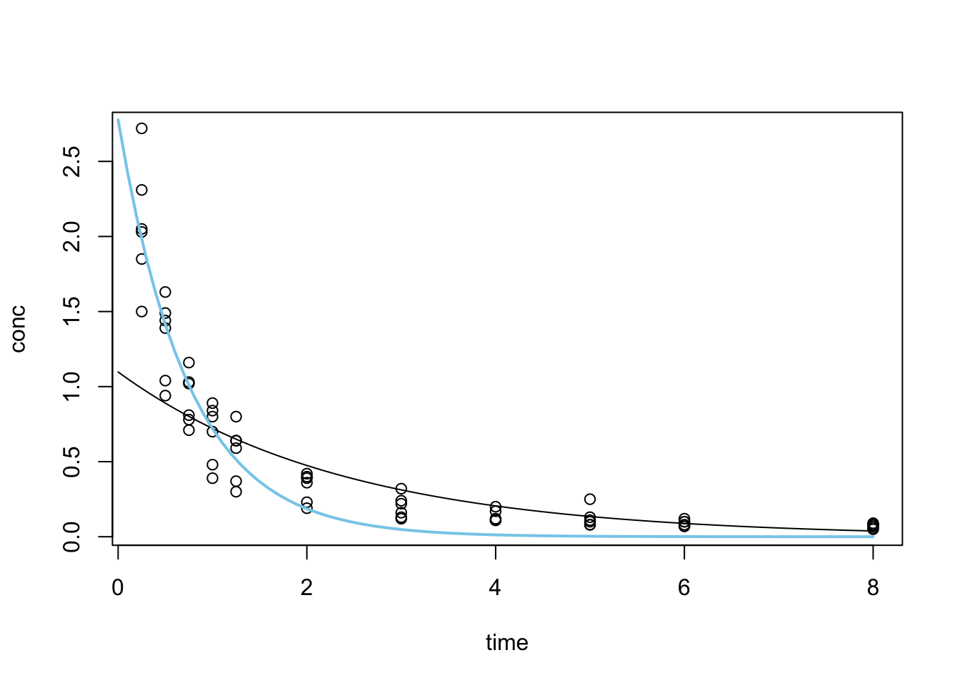 points(conc ~ time, data = Indometh_1, pch = 16, col = "blue")
