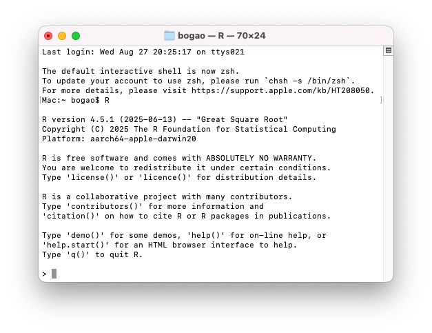 For example, in macOS, Figure B.1 (a) is a screenshot of a system level terminal, and Figure B.1 (b) is a R language specific terminal. These terminals are able to interpret text-based commands that you type between the prompts (e.g. $, >, \>) and the Enter key that you type (which indicates the end of the command in most terminals).